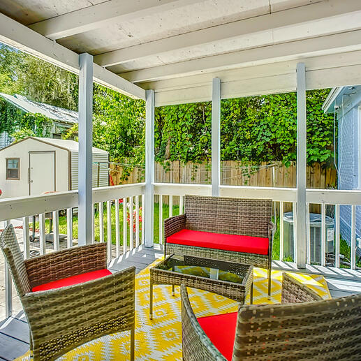 DorOs Comfort I features a private back porch with comfortable seating, perfect for morning coffee or evening relaxation. Guests also enjoy access to a fully fenced shared backyard, thoughtfully designed to provide space and comfort while maintaining privacy between units.The guest house is accessed separately through the driveway gate, ensuring a smooth and respectful experience for all guests.